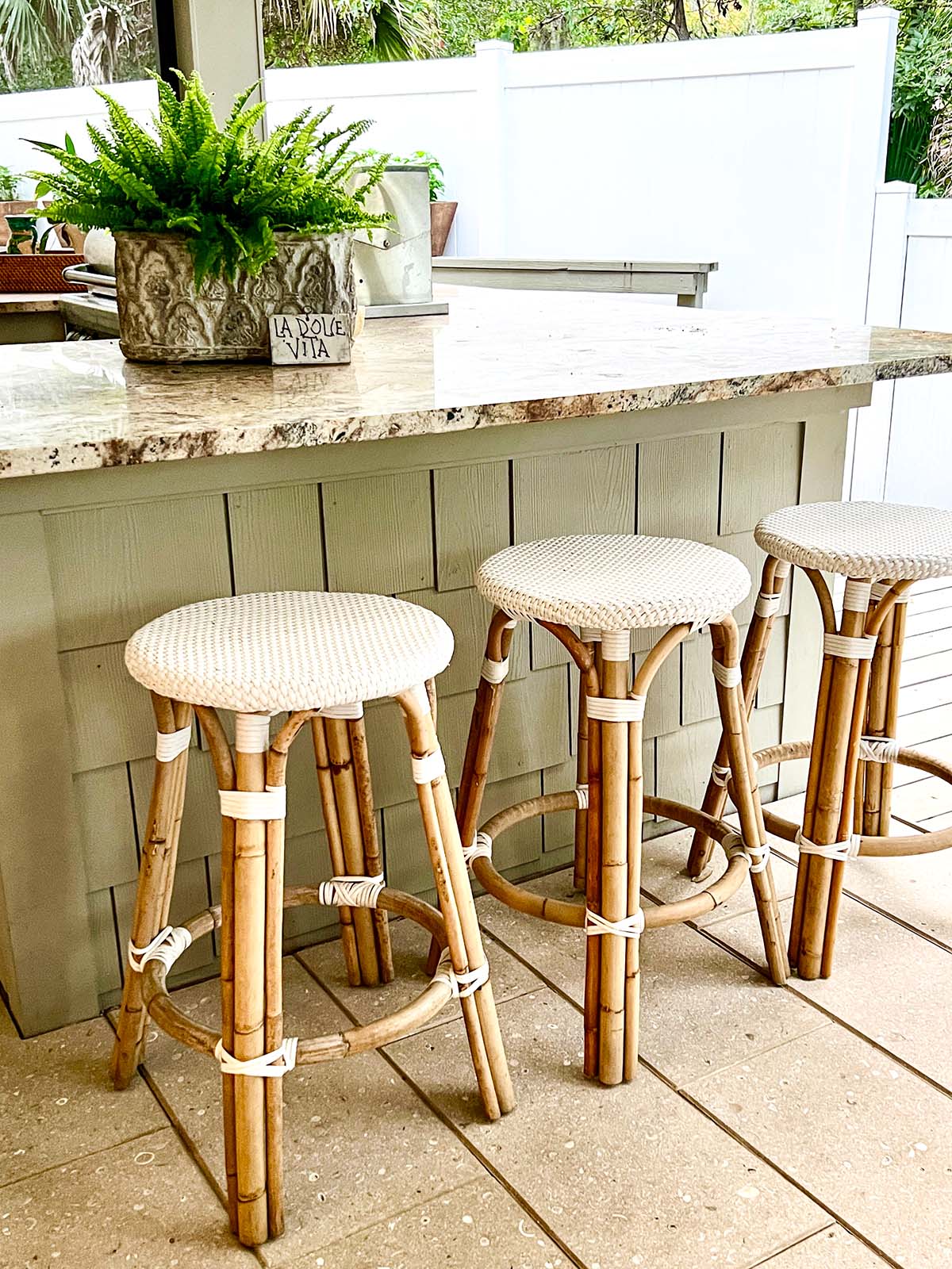 I love the look and solidity of our wood-framed wicker stools, but they are really heavy. I think lighter, more maneuverable stools are more practical for an island, and I would also consider one where the seat pivots (harder to find that look nice), or is a bit slippery to allow easier access. I had custom cushions with tailored skirts made for my four, which looks great, but I pretty much vault myself onto my stool each time I sit… AND DH rejected his cushion, so my decor didn’t quite work out as planned ;-}