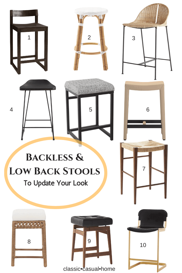 Backless stools are a great alternative if you don’t want stool backs blocking a view. Some of these can give a modern feel, coastal or traditional clean line look.
