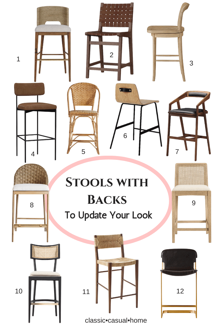 - Stools with a high or even a low to mid back-backrest can provide support and make sitting more comfortable. Stools without backs can provide a more streamlined look to your kitchen.