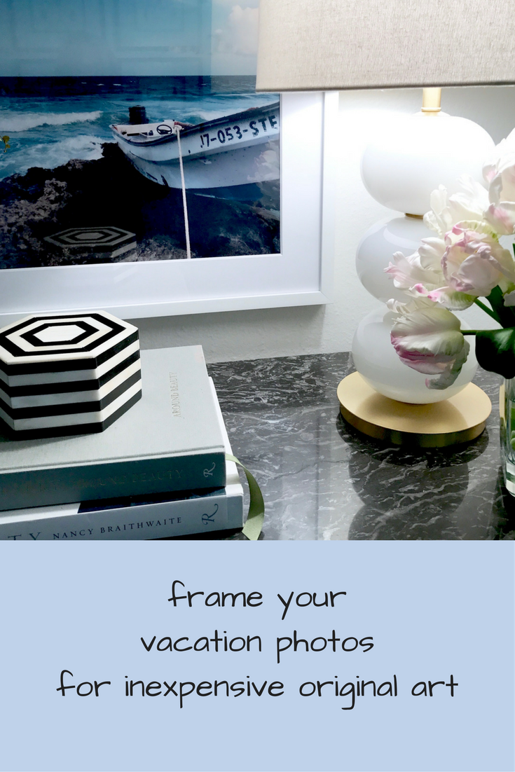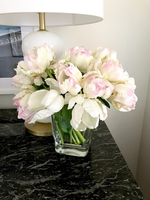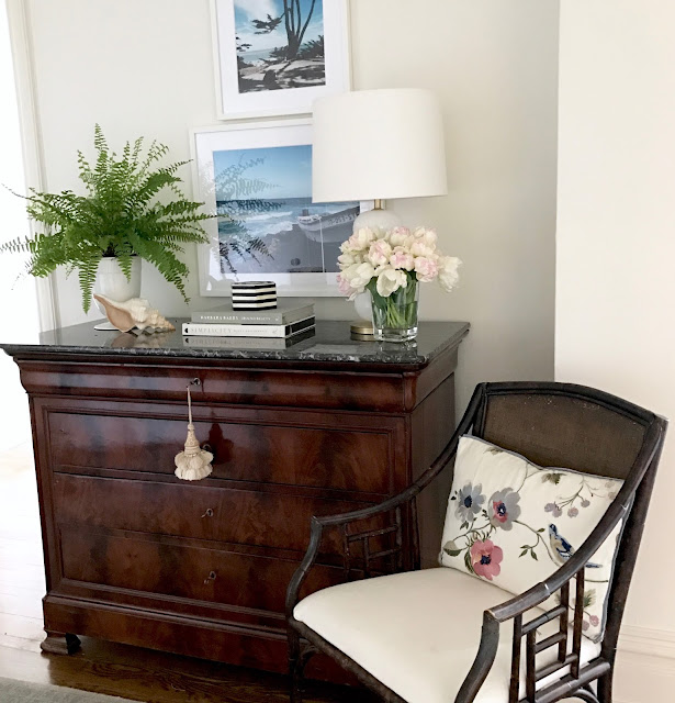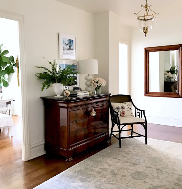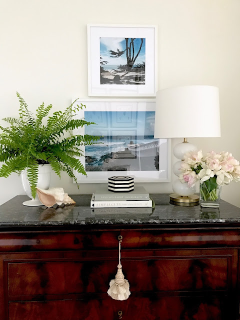 White accessories like the lamp and vase feel “fresh” right now. The black and white box also packs a little punch.
