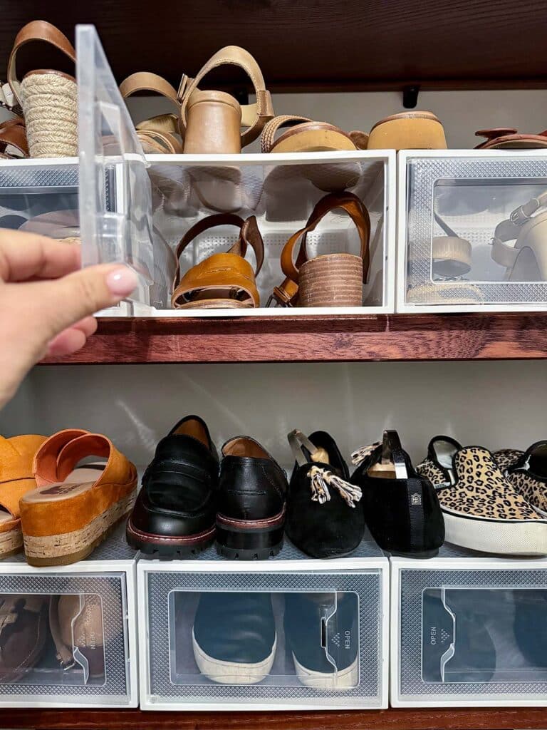 On the shoe racks, using clear boxes allows for more vertical space. These are budget-friendly from Amazon. They had to be assembled. But I love how everything is visible and they are stackable. I’m thinking about buying more since they keep shoes dust-free, too.