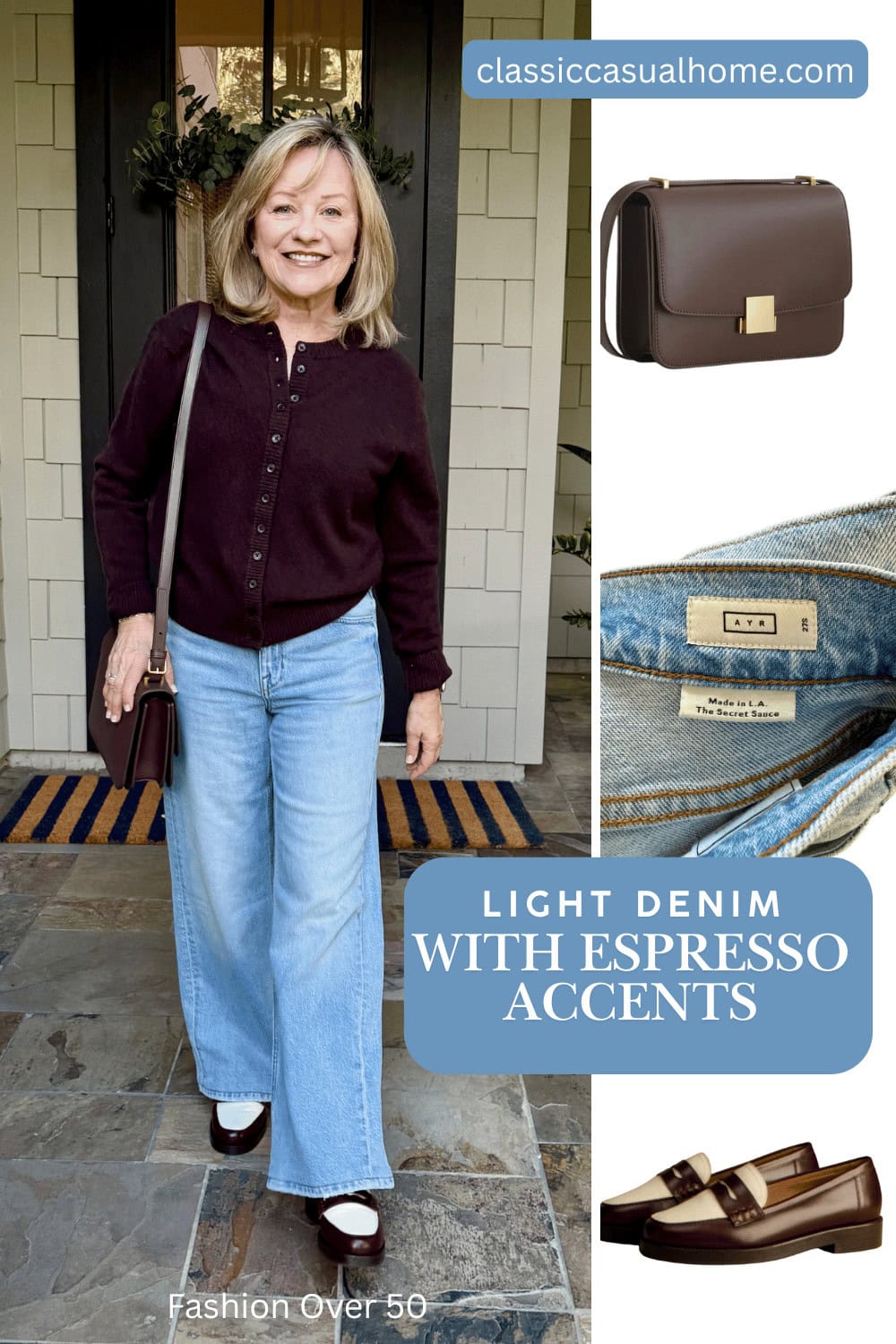 It’s usually one or two things that spark a Sunday Faves post with Annie and Cindy. In this case about the color combination of light blue and dark chocolate; it was inspired by my new coastal blue Serena and Lily napkins, a great pair of light wash denim AYR jeans and finally my new classic espresso colored shoulder bag.
