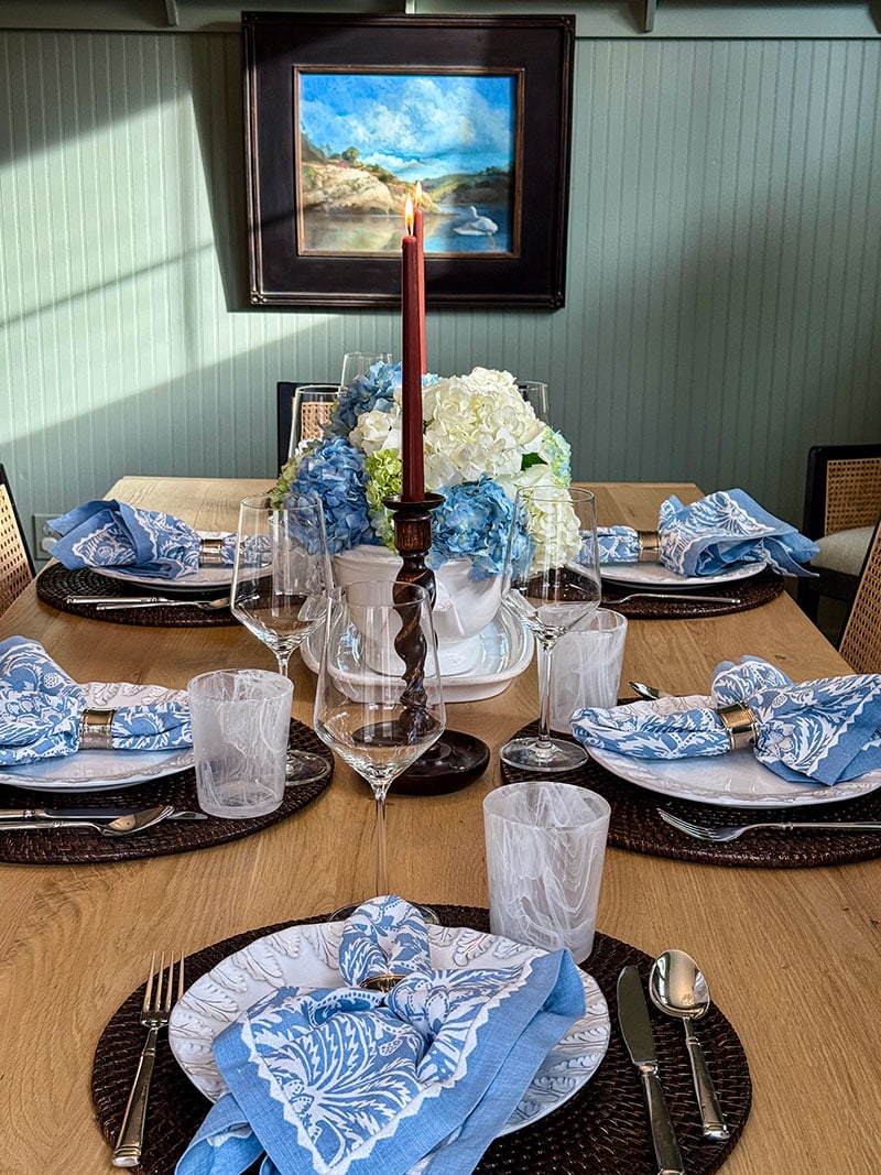 MA! You’re speaking my language. Blue is my favorite color and those napkins are gorgeous … on sale makes them a no brainer. I need to try the tape trick for flower arranging. And now I’m off to check my closet for blue and chocolate brown combinations! xo