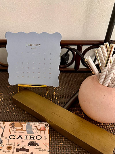 This new calendar with easel and the pretty pens (I like the fine tip and the way they smoothly write), brightened up my desk.