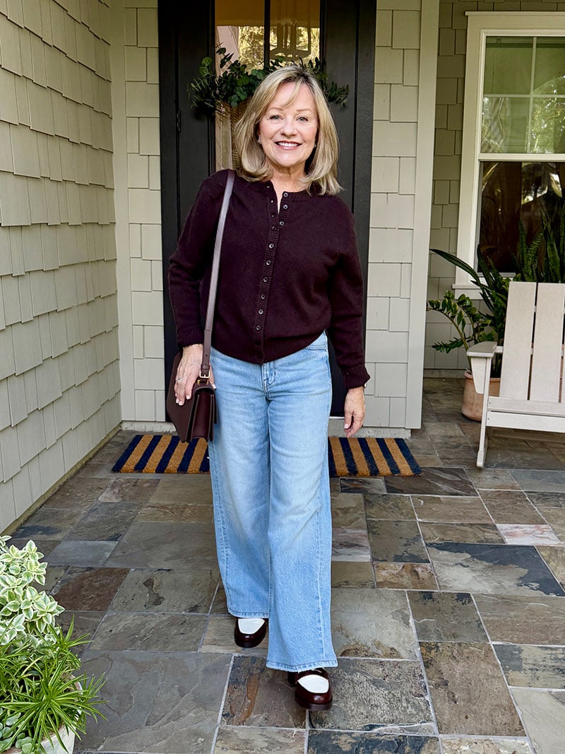 J. Crew cashmere sweater sold out but lots of other colors • similar cashmere cardigan • dark chocolate classic bag by Quince • AYR popular “Secret Sauce” loose leg jeans • off white and espresso loafers (a Christmas present from Howard). They run large even with socks so I put sole inserts in my regular size 7.
