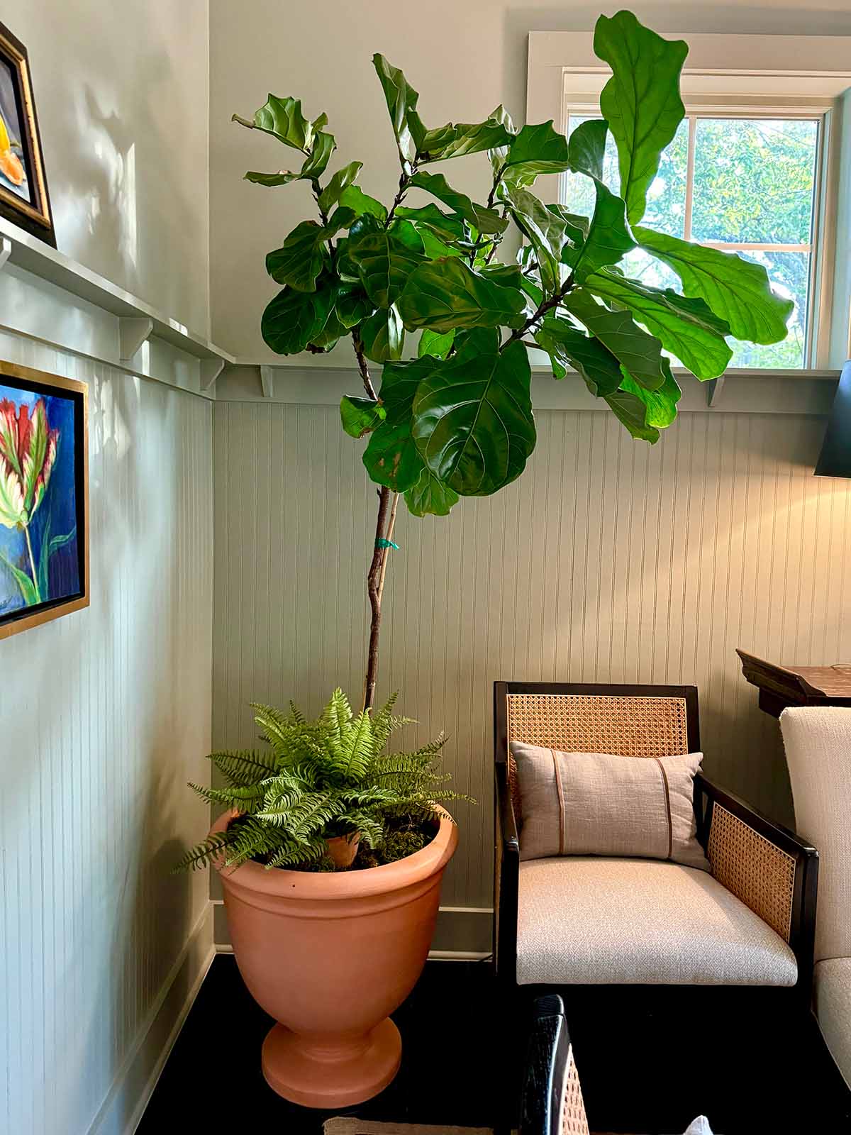 The fiddle-leaf fig tree above is real with a faux fern at the base.