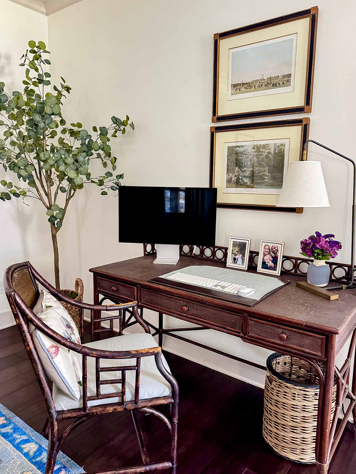 Here we mix vintage prints with a more modern lamp and contemporary monitor. A faux eucalyptus tree brightens a corner (a real one would be tough to grow here with limited natural light).