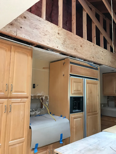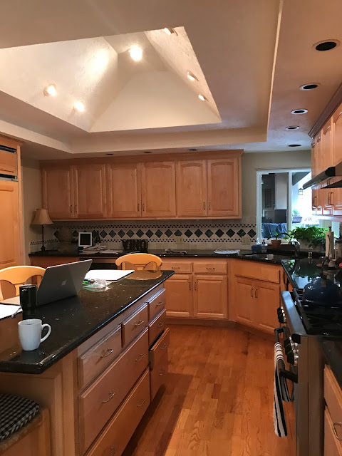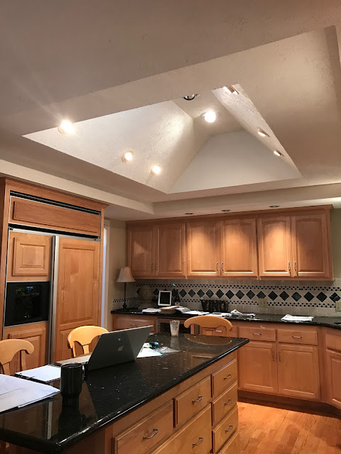 Since Lisa wanted dark countertops anyway….honing the existing granite gives it a newer look, and of course, the cabinets needed to be painted. The odd ceiling/skylight needed to be addressed…and the backsplash…yikes.