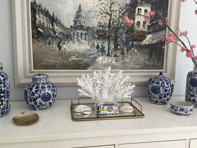 The Paris painting’s frame used to be dark brown and now it feels fresh. We accessorized with things she already owned but added that little brass tray.