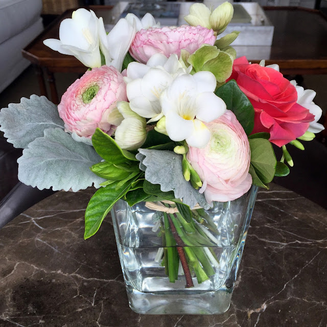 Annie brought this spring bouquet as a gift. Notice how it’s tied with raffia making it stay together?