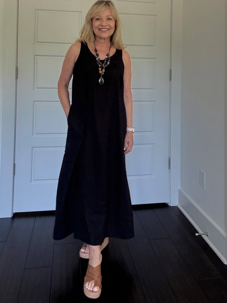 I’m wearing this linen J. Jill dress with some comfortable wedges and a scarf that I’ve had for several years. I like to pull out scarves for chilly restaurants and to cover my arms. (Although this cream helps with crepey skin).
