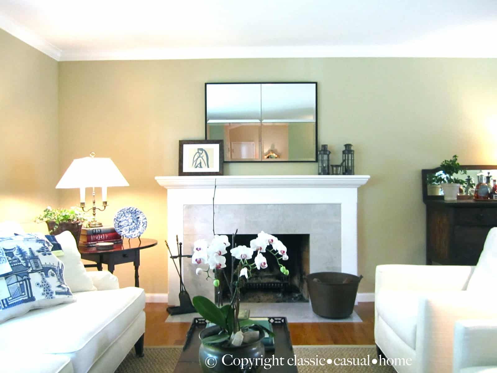 I did “my thing”, where I take all of the client’s existing accessories, put them in one place, shop from there and style ’em up. But we also bought the new Pottery Barn mirror over the mantel…on sale now (I still want to do a little more to the mantel display).