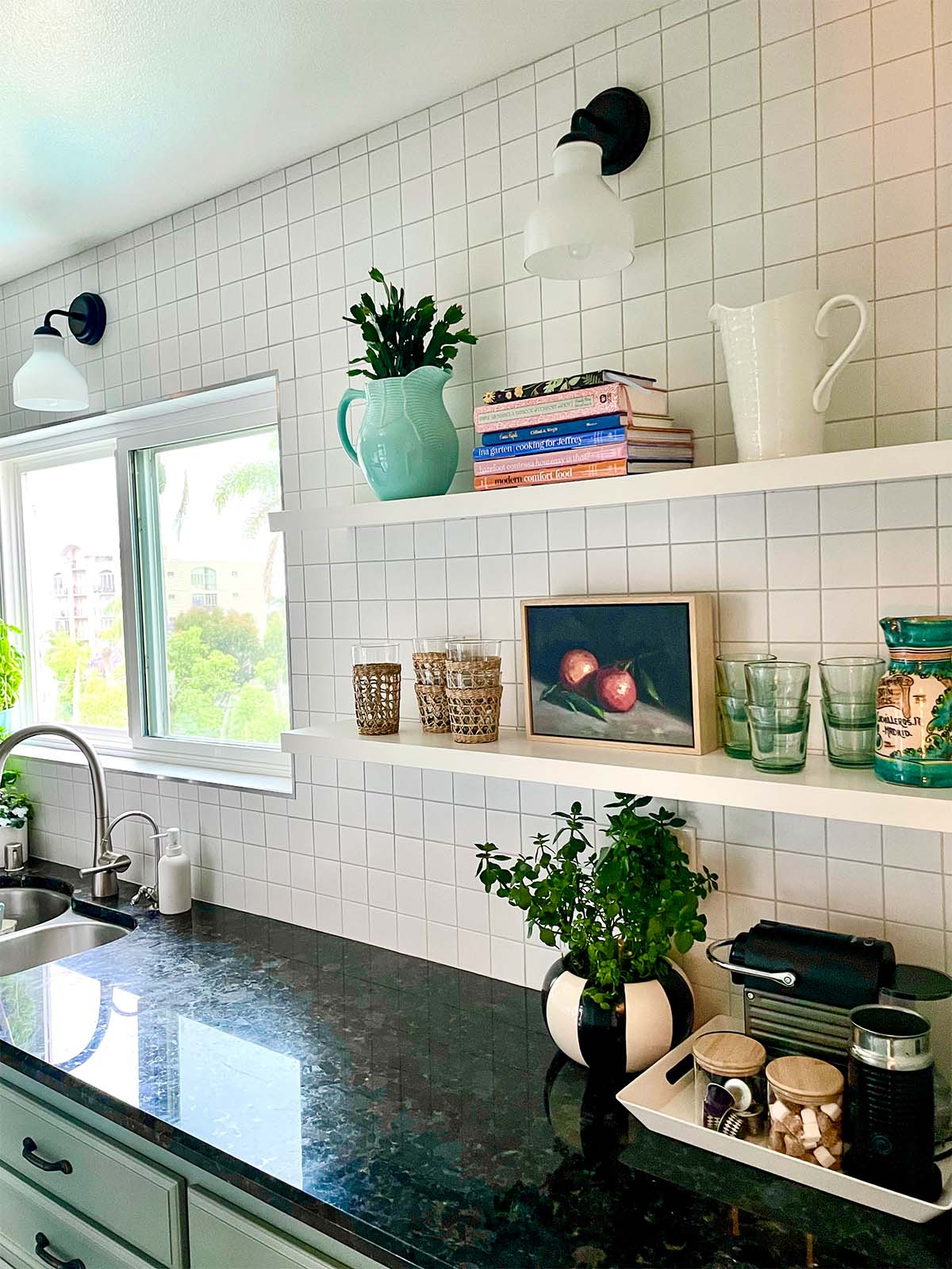 - Lighting Makeover: We added affordable updated sconces over the sink and open shelving but kept the existing flush mounts (which we may change out later on).