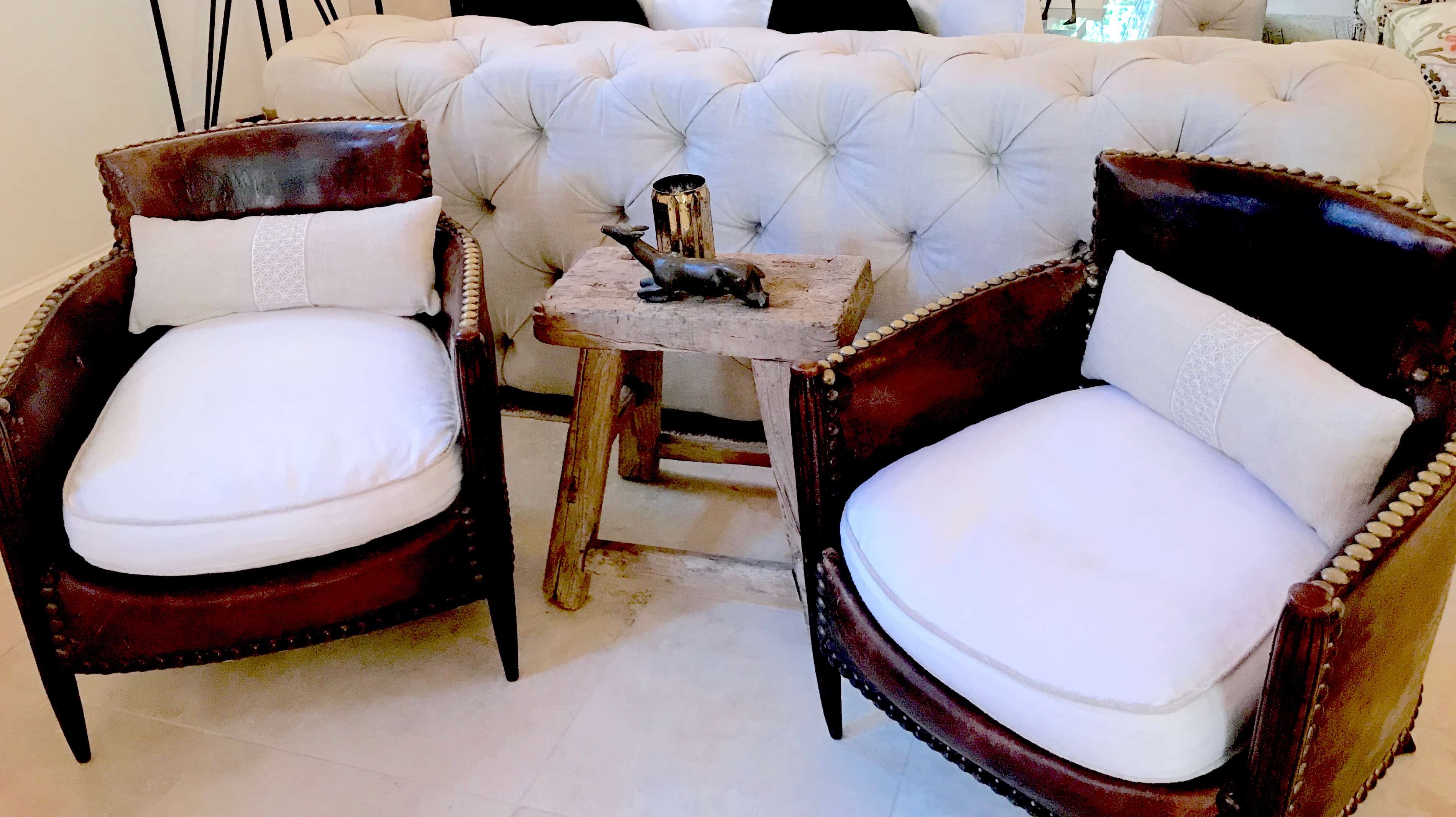 Love how these little, vintage leather chairs are refreshed with new linen cushions and small lumbar pillows.
