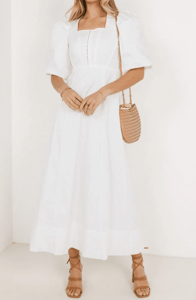 This Tuckernuck maxi dress comes in different colors. It looks cute with block heels for a summer wedding. Notice the feminine puff sleeves.