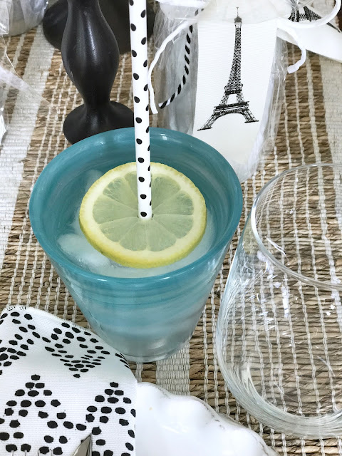 5. These black and white straws are placed in a water glass through a thin lemon slice.