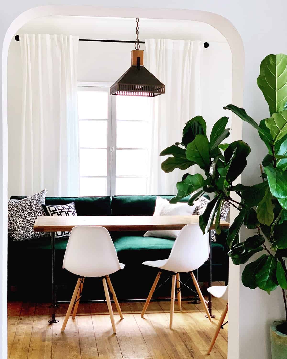 The knock-off/affordable Eames molded dining chairs are from Overstock. The curtains and rods are from IKEA. She is using her West Elm sofa from her previous apartment as a banquette. Since it is a little lower, I told her to put some pillows underneath the cushions…and the white chairs are a bit low so it works.