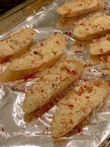- Place baguette slices on baking pan and bake for 10 minutes or so until browned and remove.