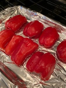 - Line a pan with olive oil and roast peppers and garlic at 425 degrees until skin is partially blackened about 10 to 15 minutes. Remove from oven and put in a covered dish.