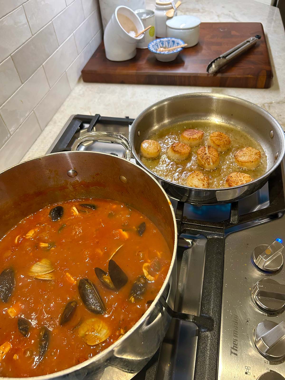 Our son, made the most amazing cioppino (seafood tomato stew from San Francisco) the other night for us and his new wife! I’m not saying this looks easy, but the multi-layered taste was incredible.
