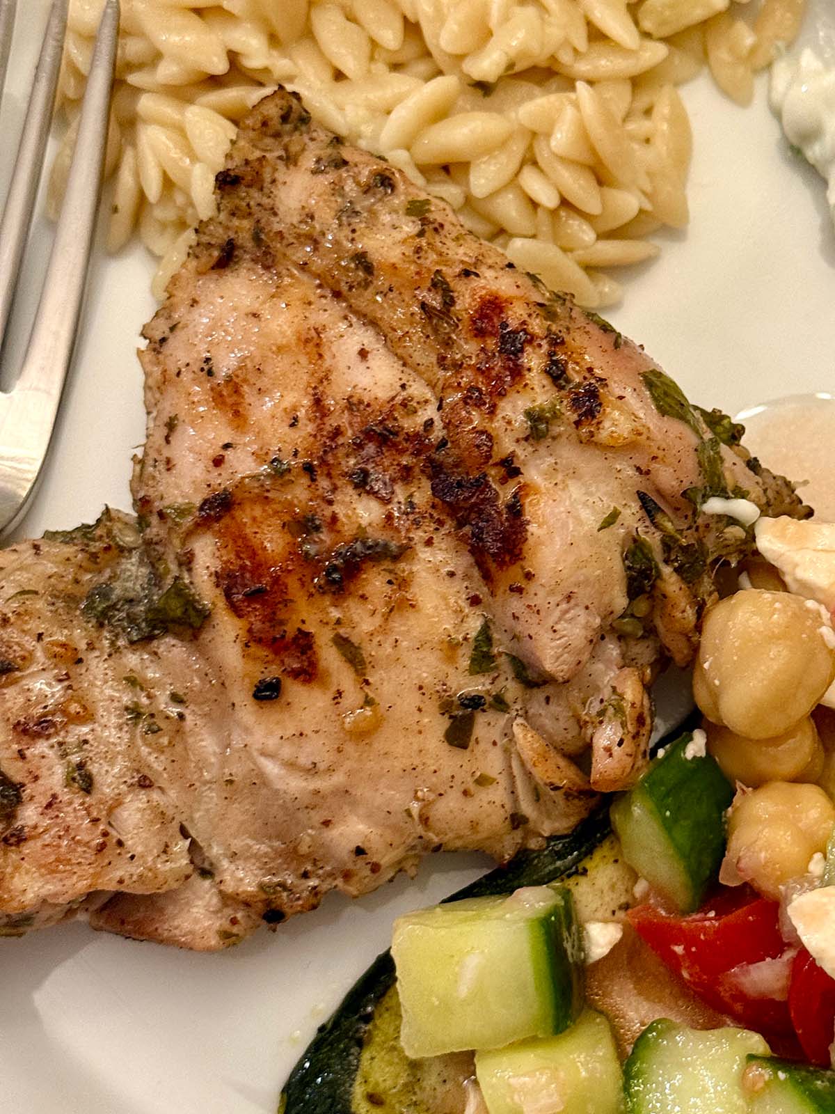 We had this succulent grilled chicken at Mark and Mercedes’ house earlier his week. Mercedes made enough to take to family friends that had a newborn recently (such a good idea). It would make great leftovers on a salad or with pita bread the next day too. She served it with a chopped cucumber tomato salad and orzo.
