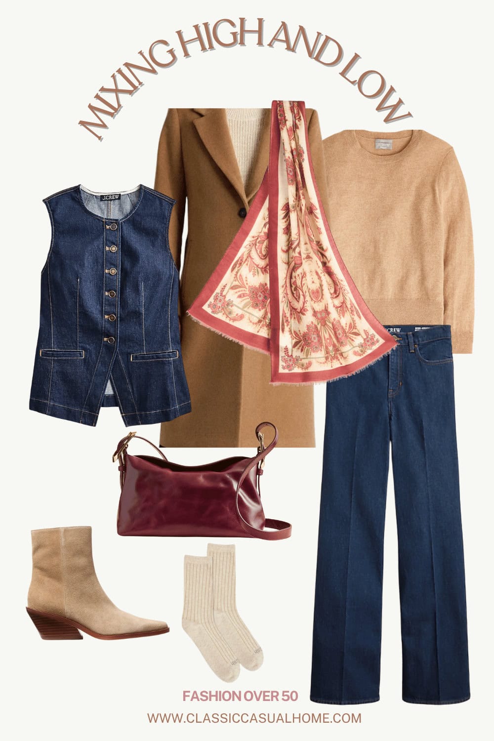 J. Crew denim vest and matching trouser jeans (I bought these in petite but am still having them hemmed a couple of inches to be able to wear them with flats–they are the most flattering wide leg jeans I’ve tried) • Quince wool cashmere coat (my friend has this and loves it) • Etro wool/cashmere/silk long scarf • Cashmere crewneck sweater (or you could wear a white button-down shirt for a classic look) • Patent leather classic small shoulder bag in burgundy • Cotton crew socks from Target • Stacked heel suede bootie on sale