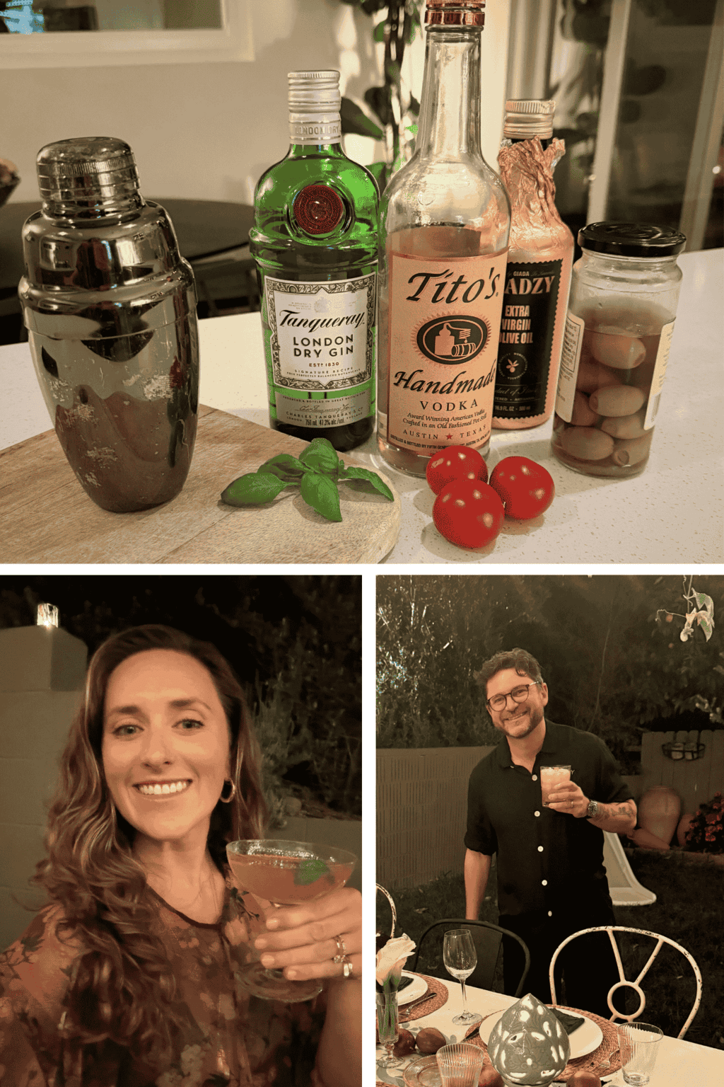 I saw a recipe somewhere and have been perfecting it over time. It’s a very refreshing drink and fun twist on a classic: Shake (2) shots Vodka (or gin!) and a splash of olive juice over ice with a crushed up cherry tomato. Strain into a martini glass (to get the seeds out) and garnish with a basil leaf and a couple of drops of good olive oil. Enjoy, but also watch out because they go down very easily 🙂