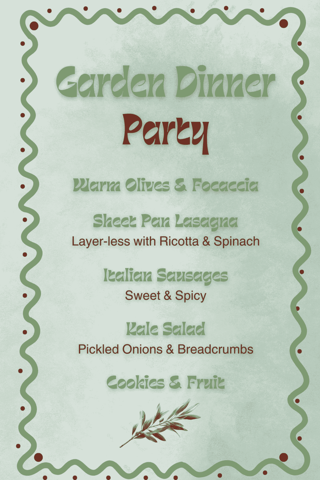 You don’t want to be stuck in the kitchen when your guests arrive so I came up with a menu that I could quickly prep during nap time and then pop into the oven when the guests arrive.