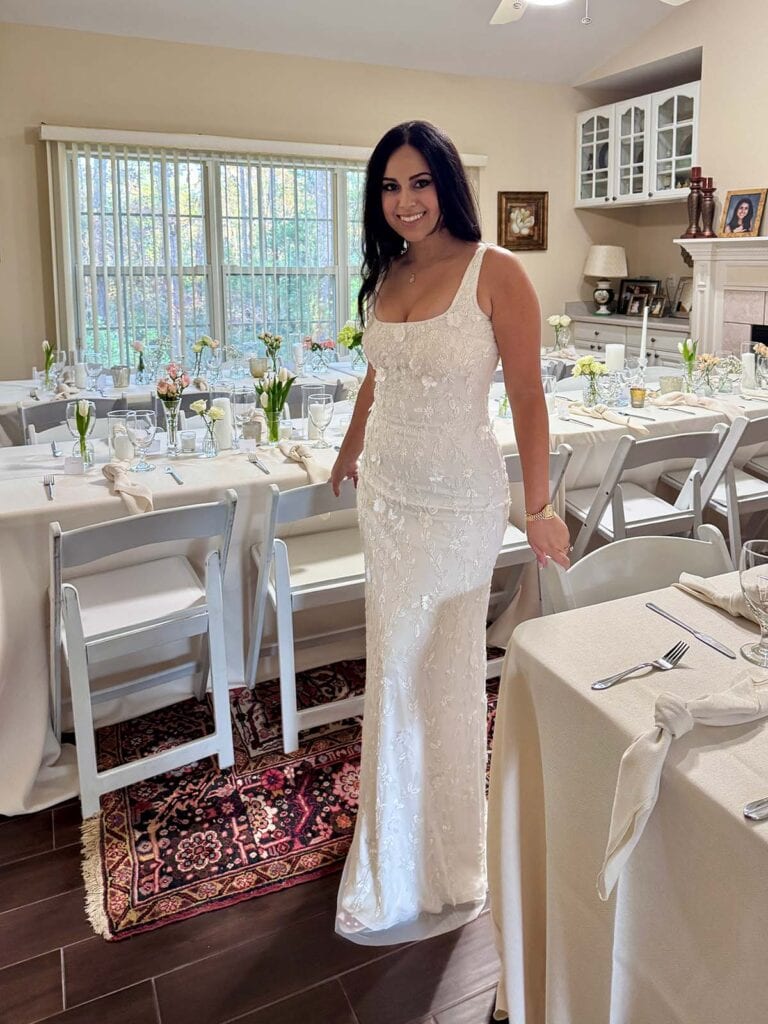 Beautiful bride, gorgeous table settings for the wedding dinner, lovely new M-I-L!