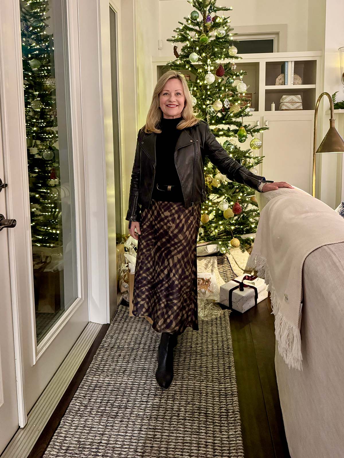 We kept the celebrations going with dinner out with the bride and groom. I wore this Rails midi skirt with a black turtleneck, new leather belt and my 12-year-old leather (good investment) biker jacket. It felt celebratory but still casual and cozy.