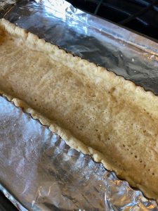 - Roll the dough out on a lightly floured surface. I used a rectangular tart pan or use 10-inch round tart pan with a removable bottom. Roll the dough up onto the pin and lay it inside. Press the dough into the edges of the pan and fold the excess dough inside to reinforce the rim. Cover the tart pan with plastic wrap and put it into the refrigerator for another 30 minutes to rest.