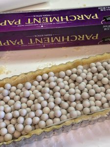 - Put the tart pan on a baking sheet and prick the bottom of the dough with a fork. Cover the shell with a piece of parchment paper and fill it with pie weights or dry beans. Bake for 25 minutes. Remove the parchment and weights. Lightly beat the egg white with 1 teaspoon water and brush it onto the bottom and sides of the tart shell; set aside to cool.