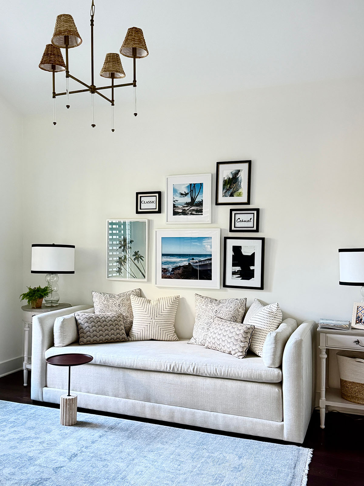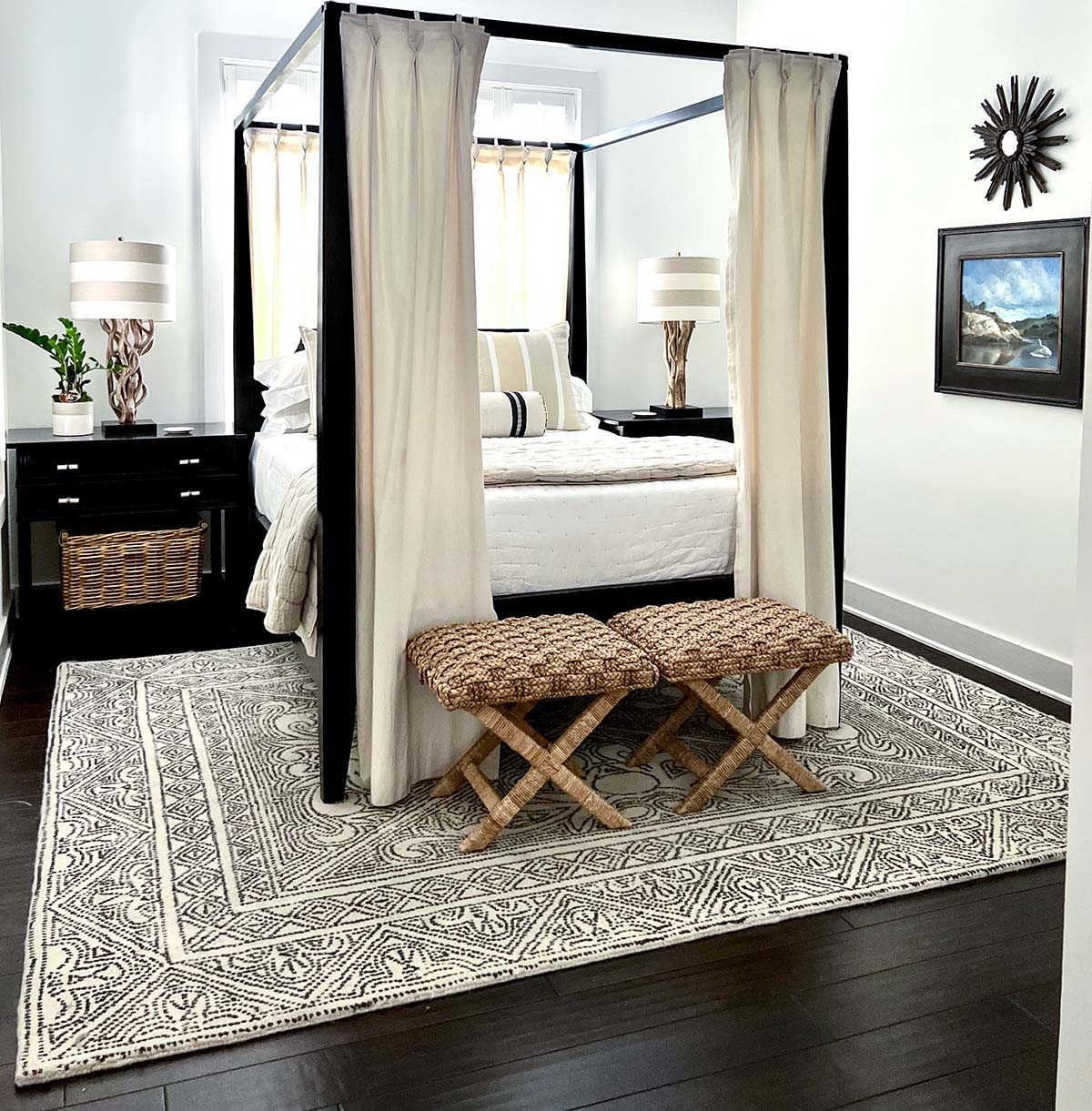 How do you feel about black and white decor with texture and pops of color? This popular combination never goes out of style in fashion and in decorating. We never tired of it in our home.