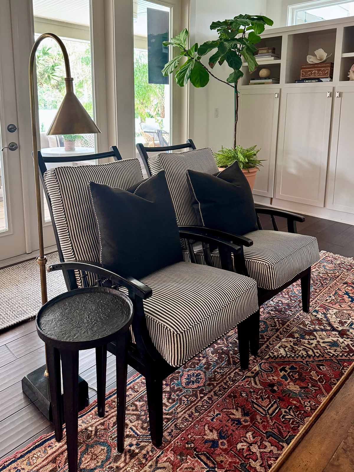 I love your rug in your living room refresh it turned out amazing. We must be on the same thought process on chairs. I just redid a vintage loveseat and chairs in a black-and-white ticking stripe, and I love how they read as a neutral, and can go in any room.!! I have been looking for a rug like yours for a long time. It’s really beautiful.! and I love how the black mantle ties into everything as well. Great job.!