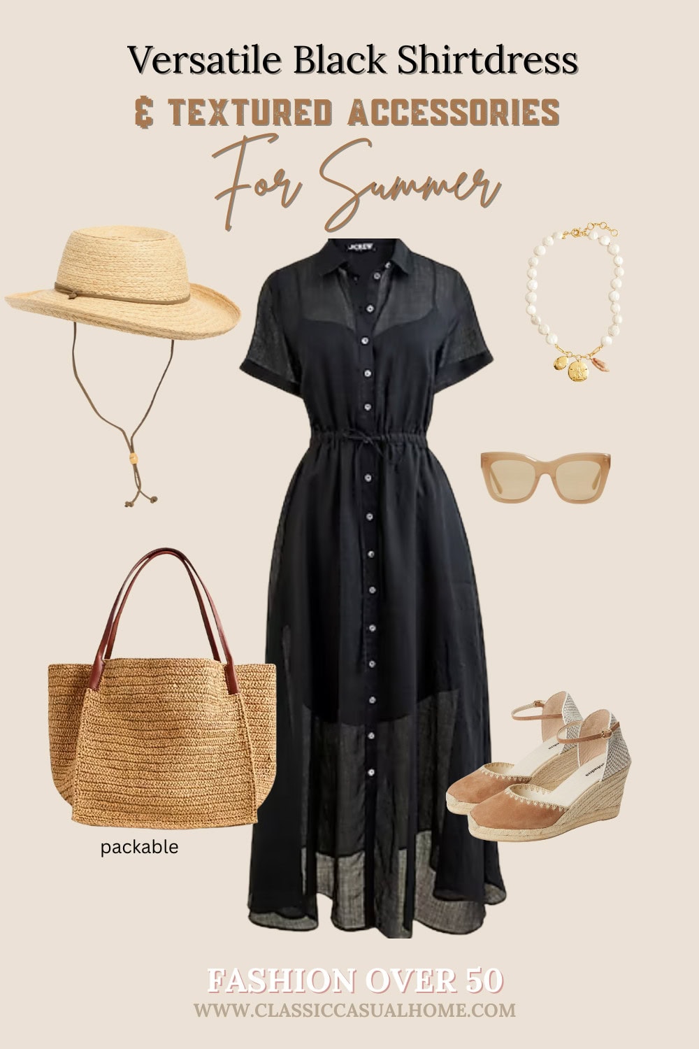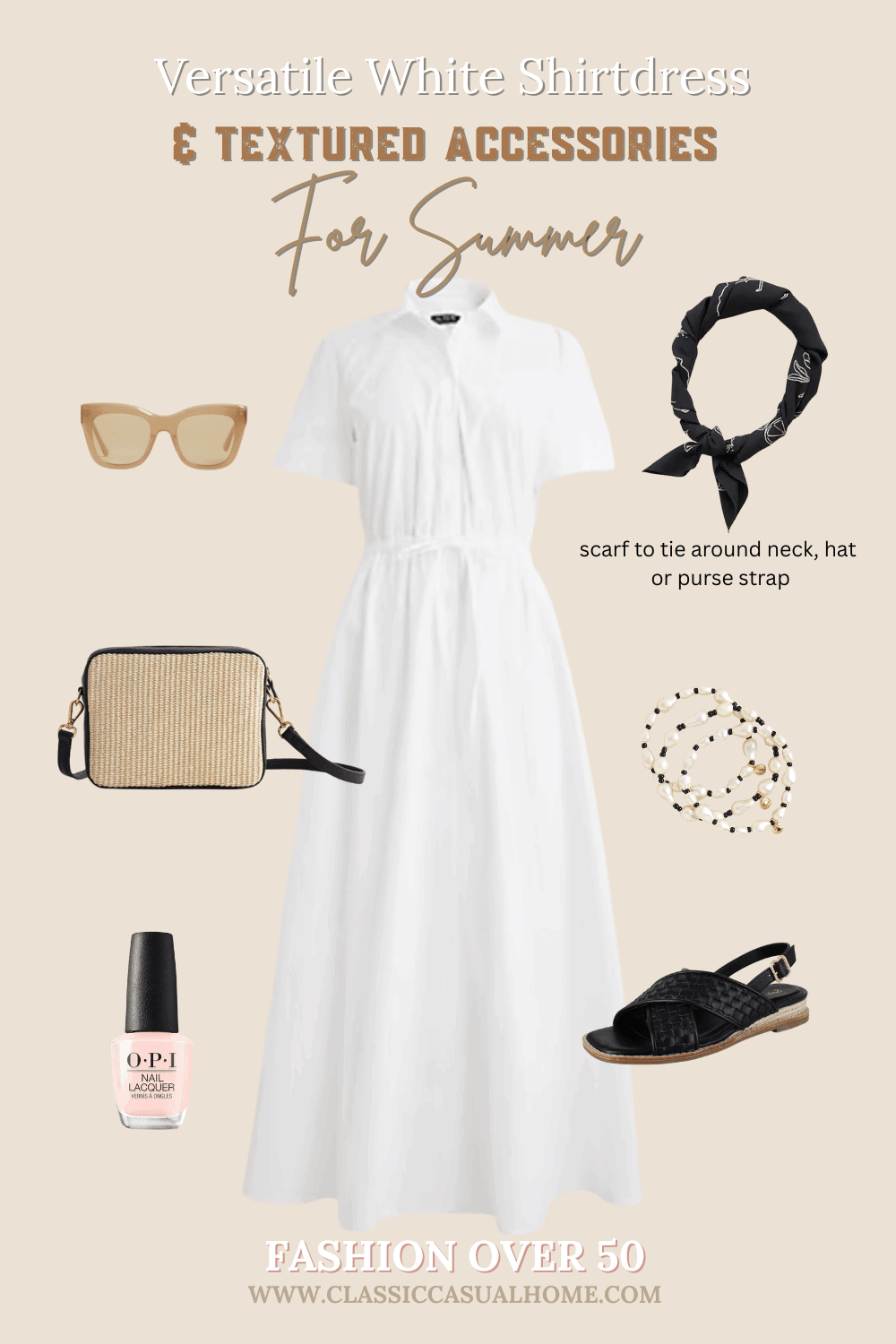 A shirtdress is so versatile and perfect for a lunch out or on a European vacation. Here, I am showing two neutral dresses with woven accessories.