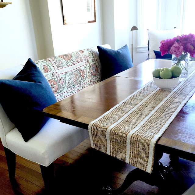 With the suzani patterned throw (from Ebay) and perhaps it being summer, it felt like it was time to simplify the gallery wall. Believe it or not…I took six or seven things off the wall. Our daughter, Alie was here and she was the lucky recipient of my vintage leftovers.