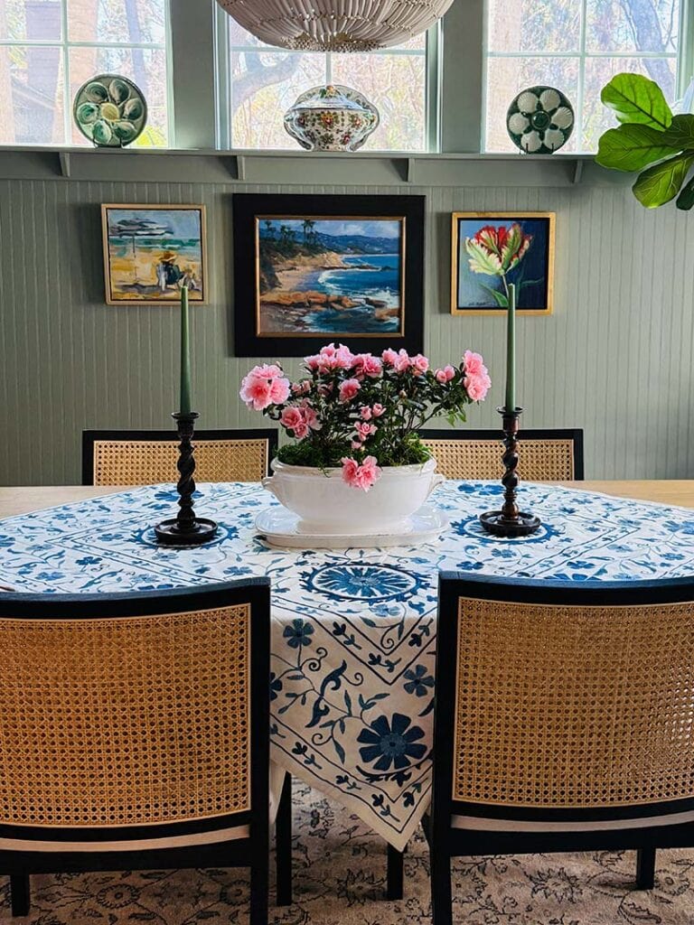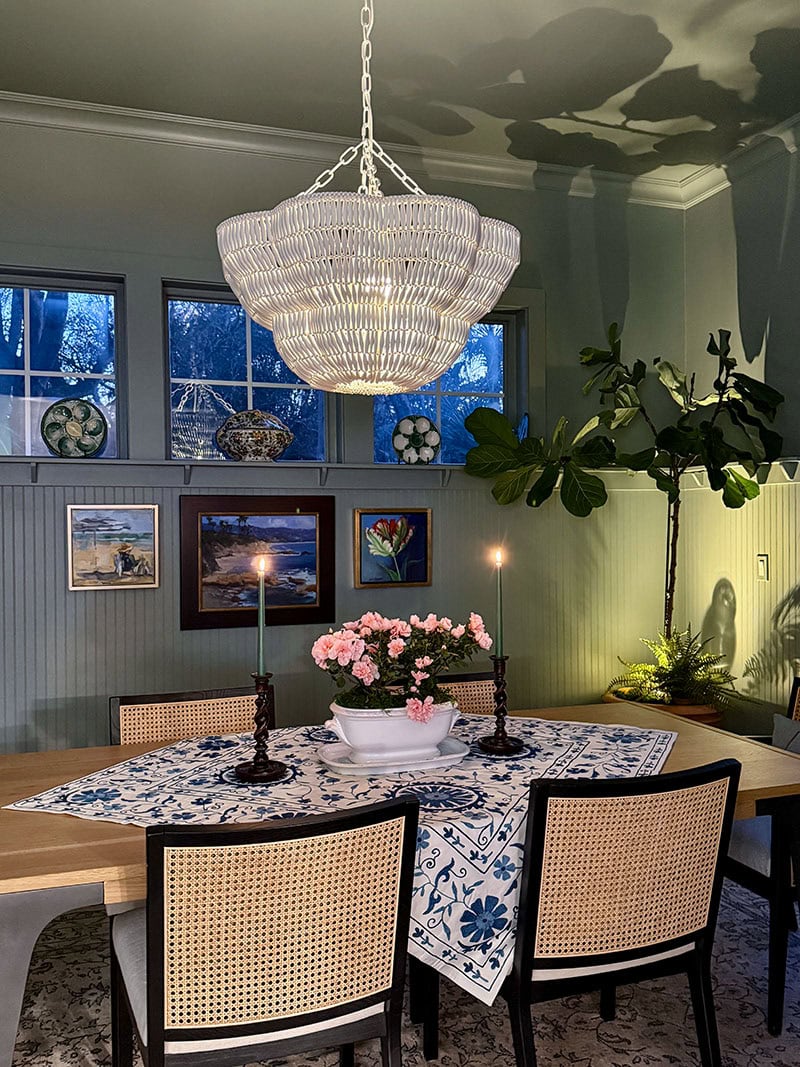 This avoids feeling like you were “sitting in a hole” at the table and accents like the centerpiece really pop.