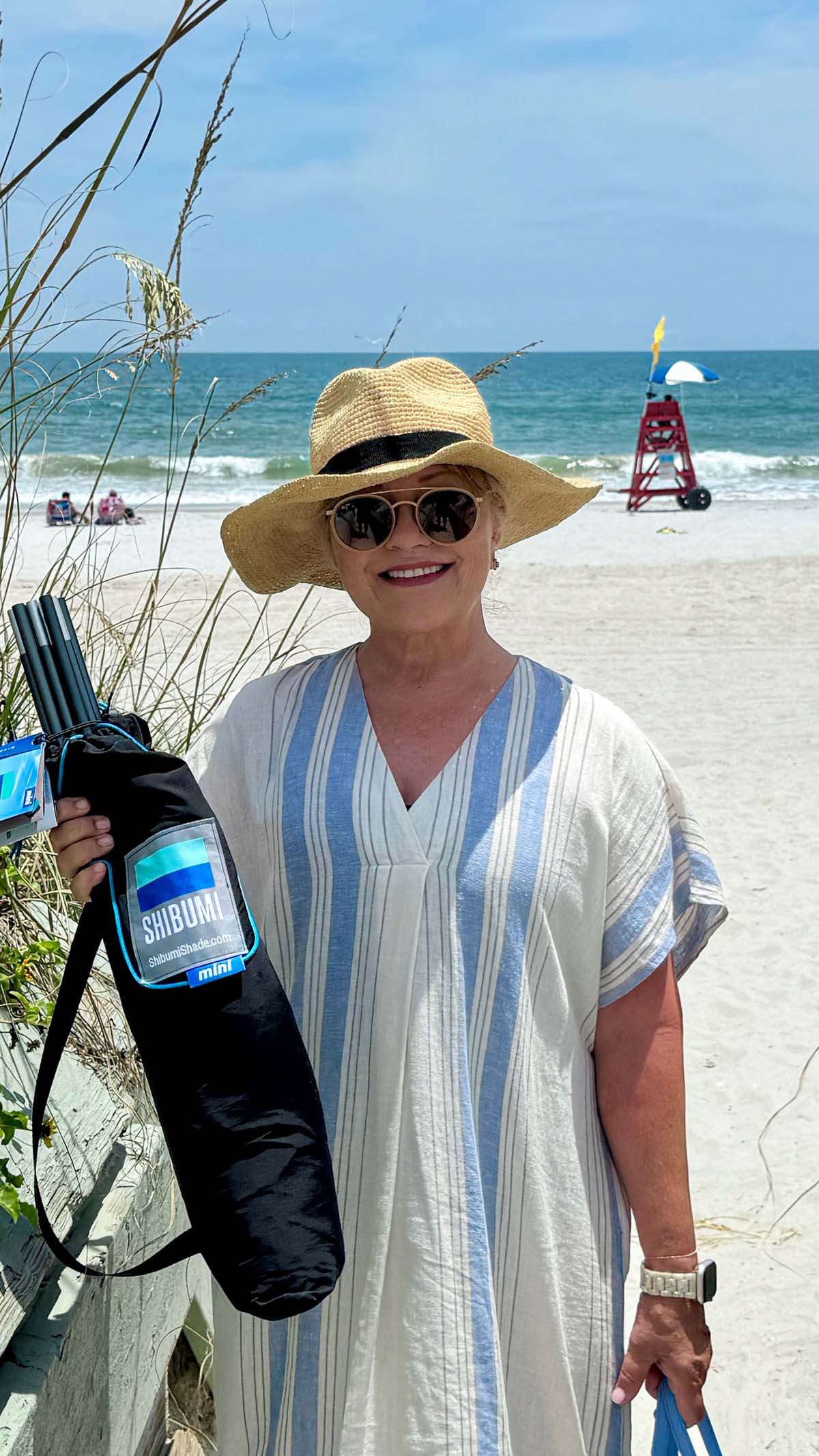 We purchased the Shibumi Shade Mini on Amazon which is just for two people (and Chief). I put it up by myself in about four minutes. And it’s so lightweight to take to the beach.