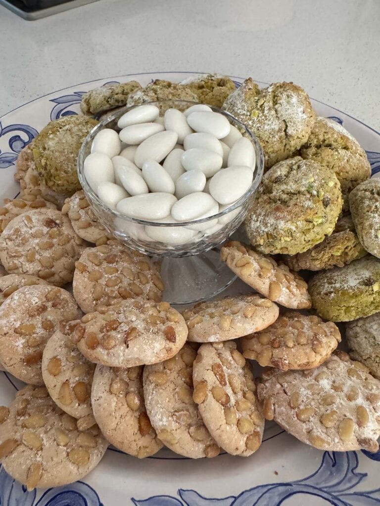 - Italian bakery cookies with bowls of fresh cherries and candy coated almonds for dessert