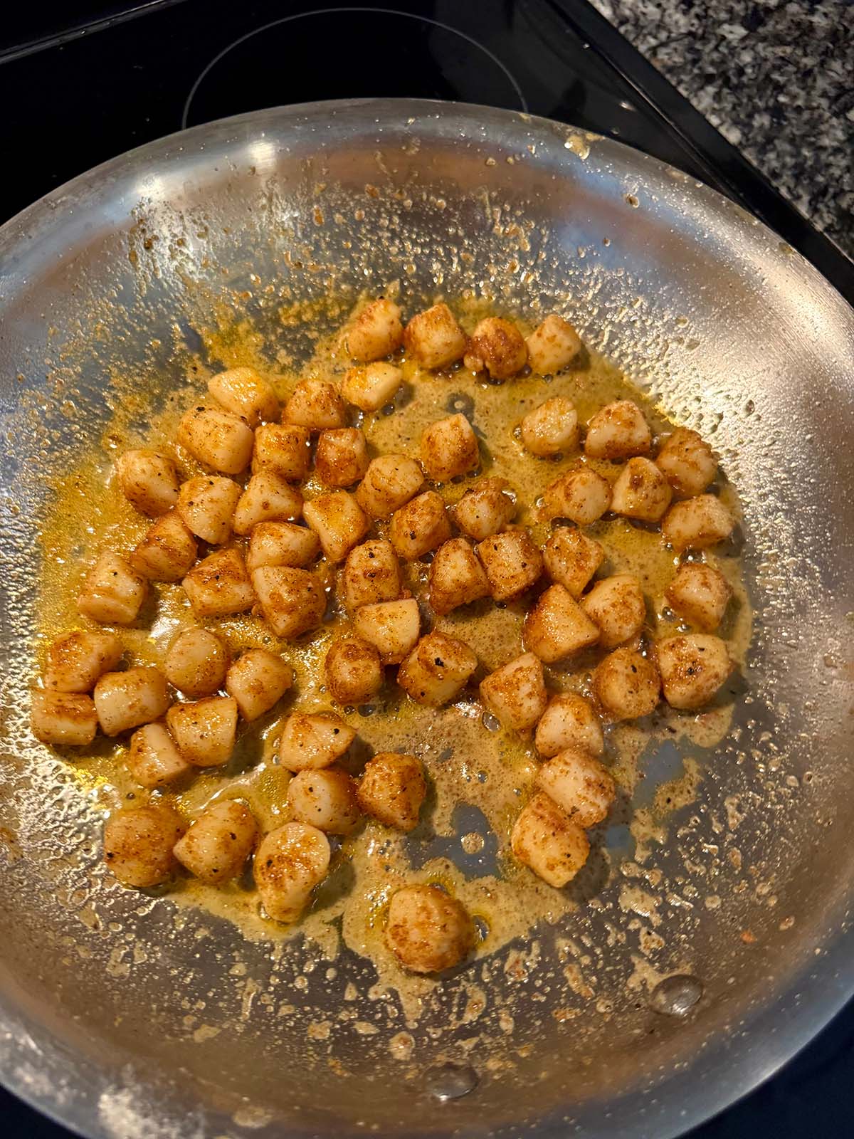 - Sauté the bay scallops for 2 minutes on each side (use a stainless steel pan if you want them golden brown). Flip only once.