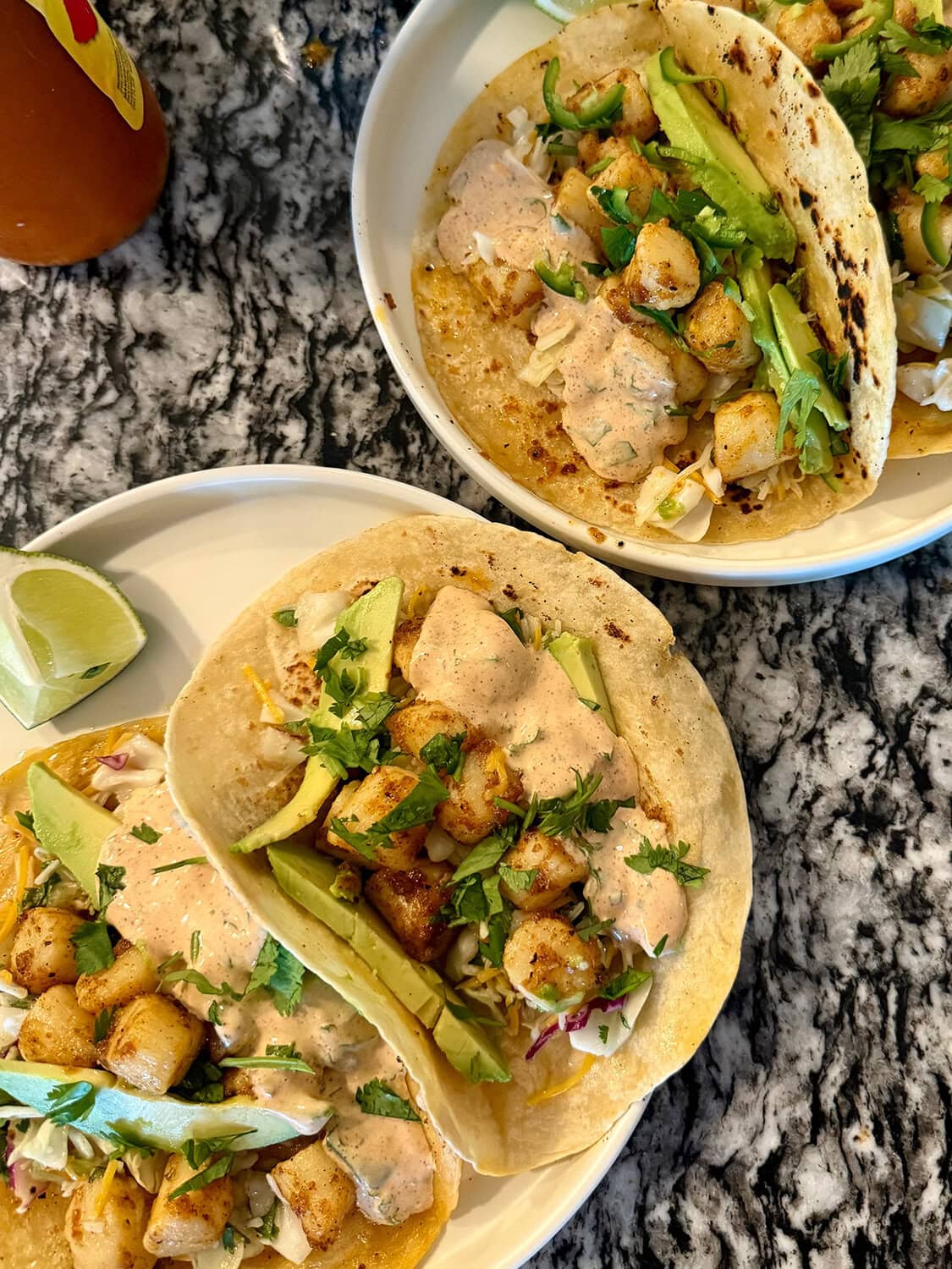 - Assemble your tacos with cabbage and avocado slices on the tortillas, followed by the seared scallops, chopped cilantro, and finish with the Baja sauce.