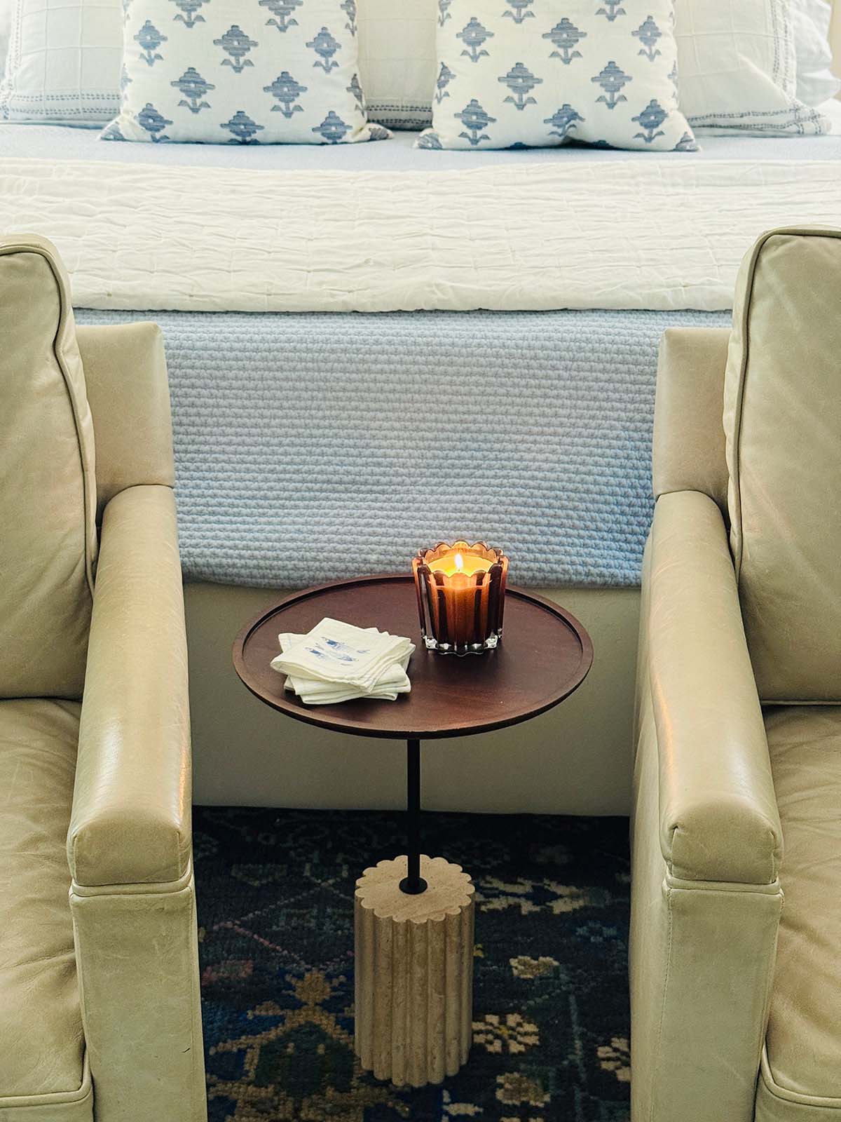This little accent table from the new Studio McGee line at Target has a sturdy travertine scalloped base and dark wood top (use coasters). It looks and feels more expensive than it is. The scalloped Harvest Chestnut candle smells great for Fall.