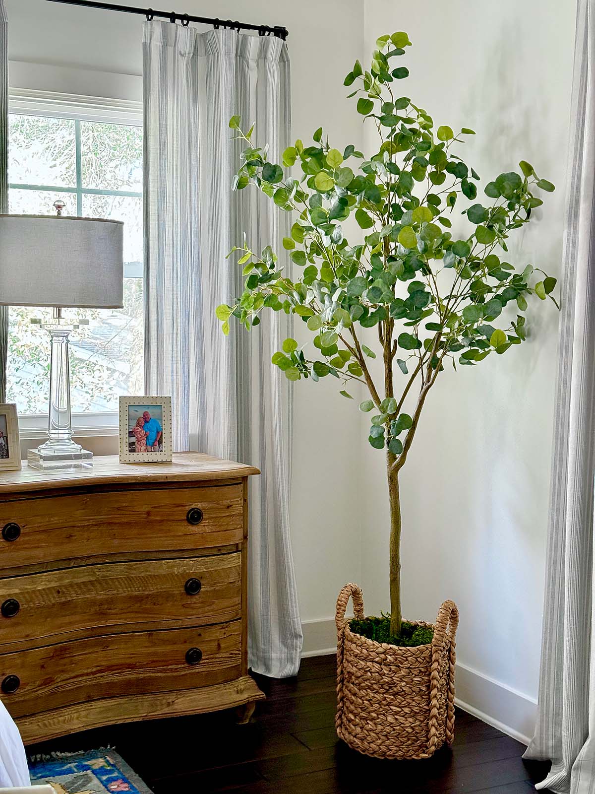 I couldn’t get a tree to live in this corner without a lot of sunlight. So, I purchased this good looking faux eucalyptus tree and added the handwoven basket and moss.