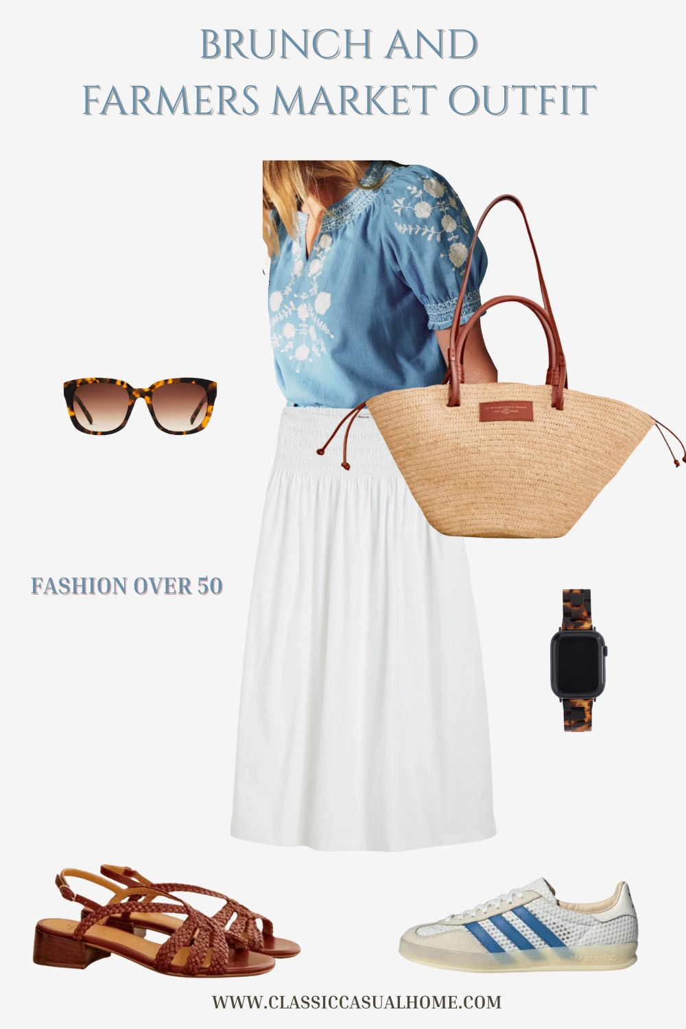 Quince Polarized Sunglasses • Embroidered Cotton Blouse (I ordered this) • Sezane Straw Bag (would love to have) • Cotton Poplin Midi Skirt• Tortoise Apple Watch Band • Woven Leather Sandals or Gazelle Indoor Sneakers