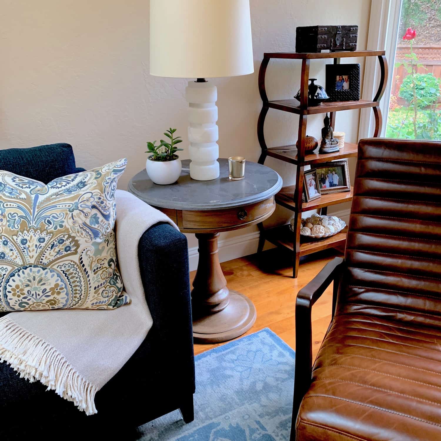 Like this stacked alabaster lamp from Visual Comfort. They feel so fresh and organic. No two are alike. We placed them on top of matching round stone topped end tables from Arhaus. I don’t see the tables on their website anymore (good thing we grabbed them, Melina). Mix in other materials like stone or iron with wood.