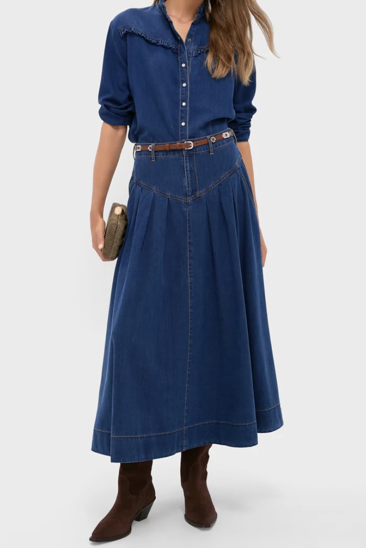 I’ve been admiring this western denim on denim maxi skirt outfit from Tuckernuck. Denim maxi and midi skirts are on trend this season.