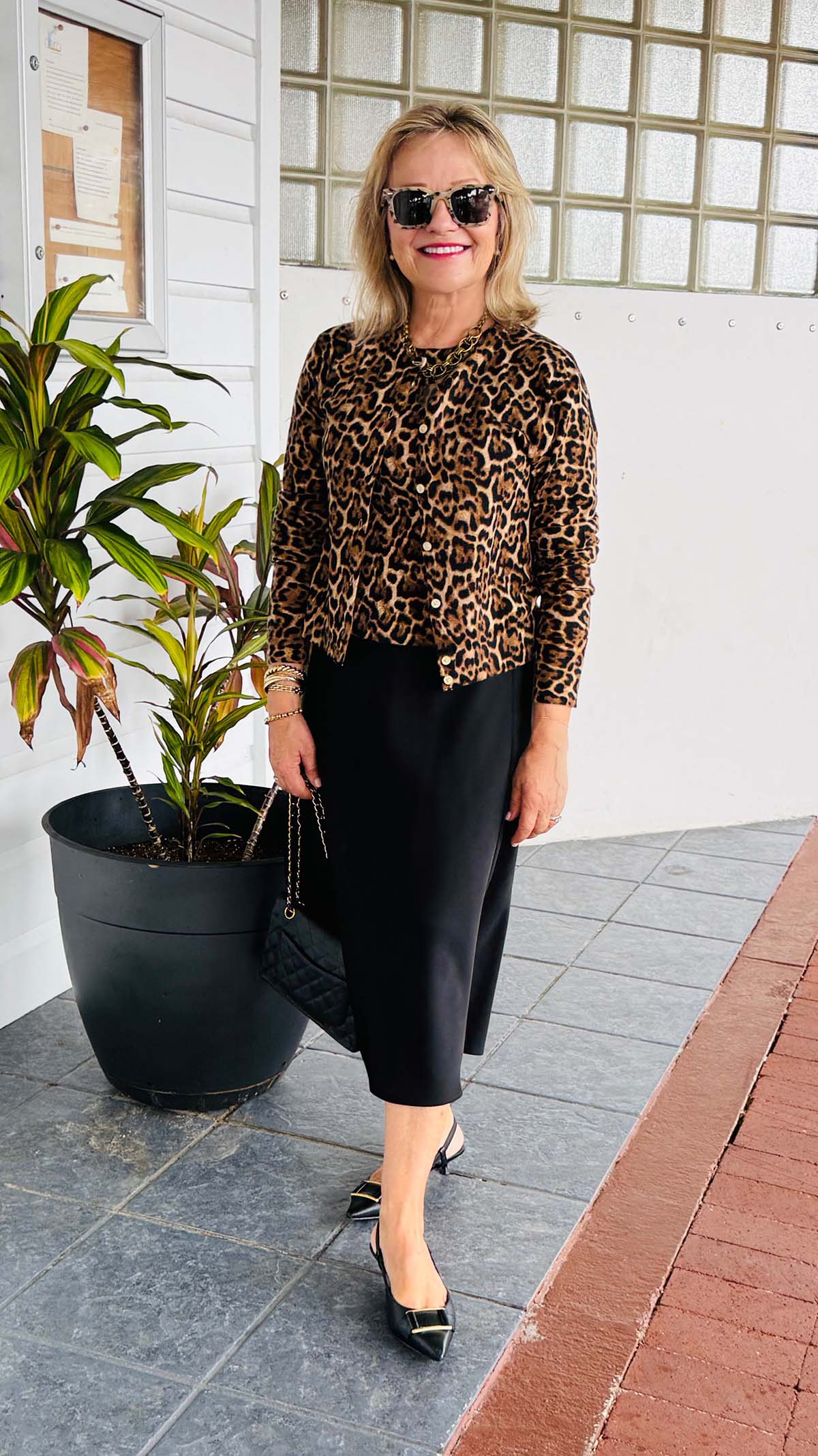 Light cashmere cardigan • leopard cashmere shell (both on sale–I bought mediums)• slip skirt • classic Chanel bag (20 years old! — you can buy it on the Real Real) Or new at Chanel • kitten heels (that are more comfortable than regular heels and look a little dressy) • sunglasses