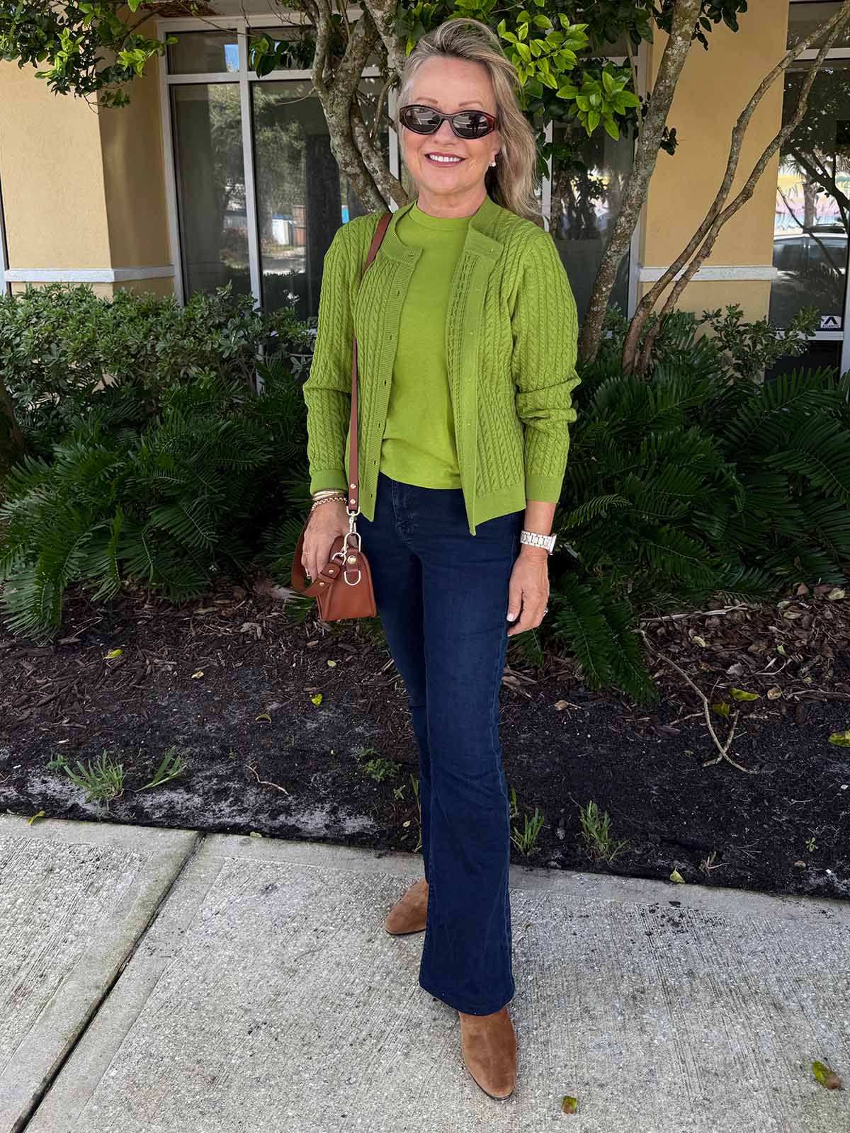 J. Crew Lime green cable knit cardigan (size medium) • matching tee • boot cut blue jeans • booties • sunglasses • my convertible leather crossbody Longchamp bag is from a few years ago…this one is similar