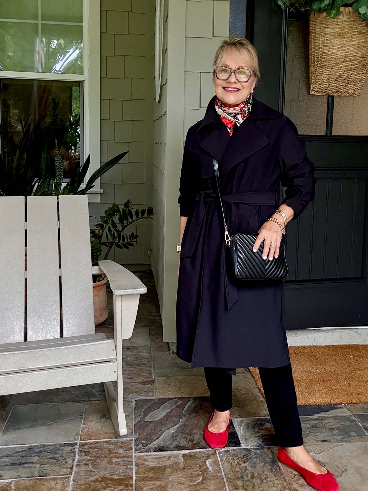 This is a great trench with attached belt from Athleta (good for travel). I’m wearing it with an old red and black silk scarf, Quince black jeans, Italian leather quilted crossbody bag and comfortable Birdies red suede ballet flats.