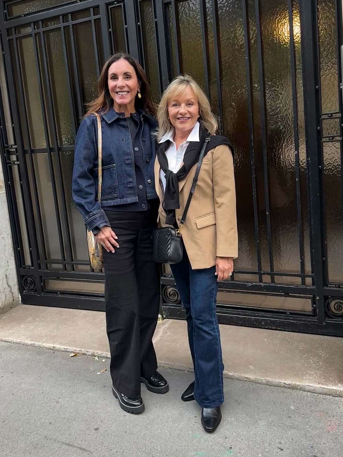 Mercedes: denim cropped work jacket (small) • Frame Le Slim Palazzo black pants • lug soled loafers (Mercedes says “they are wall all day comfortable”)